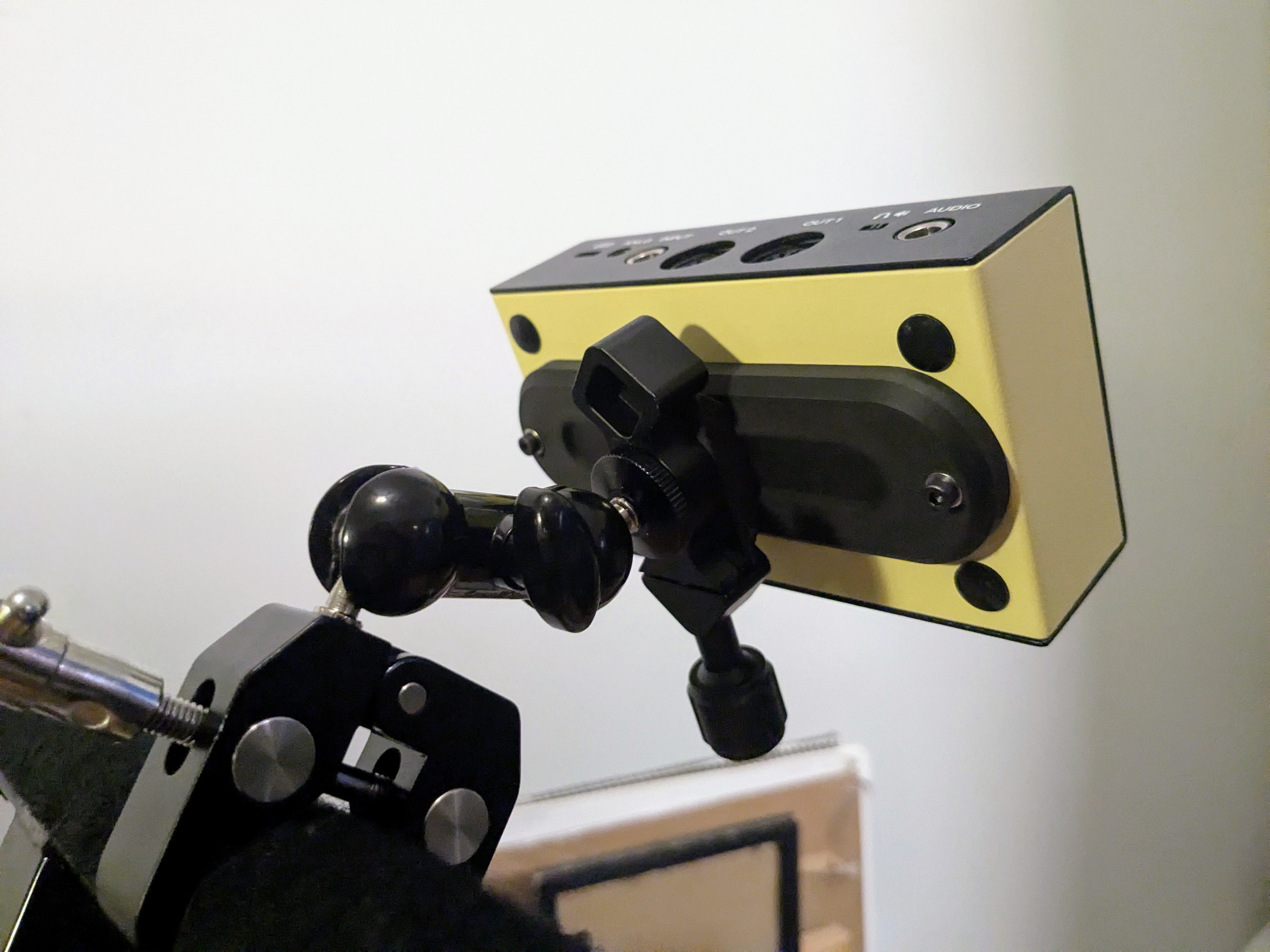 Since the midronome tilts backwards due to connected cables (when it is not standing on a surface), I put two small flat magnets under the device. I recycled the magnets from some packaging. They hold the Midronome very well, even upside down.