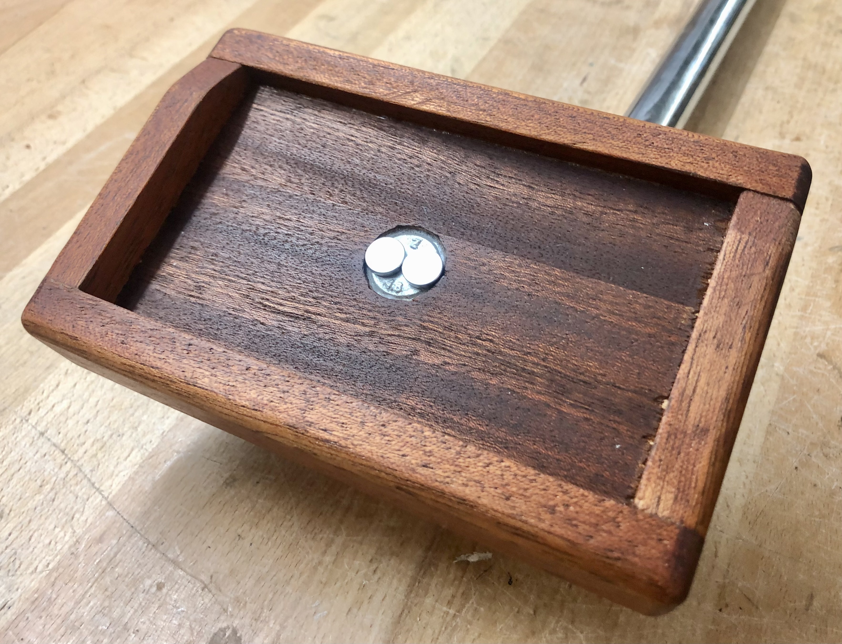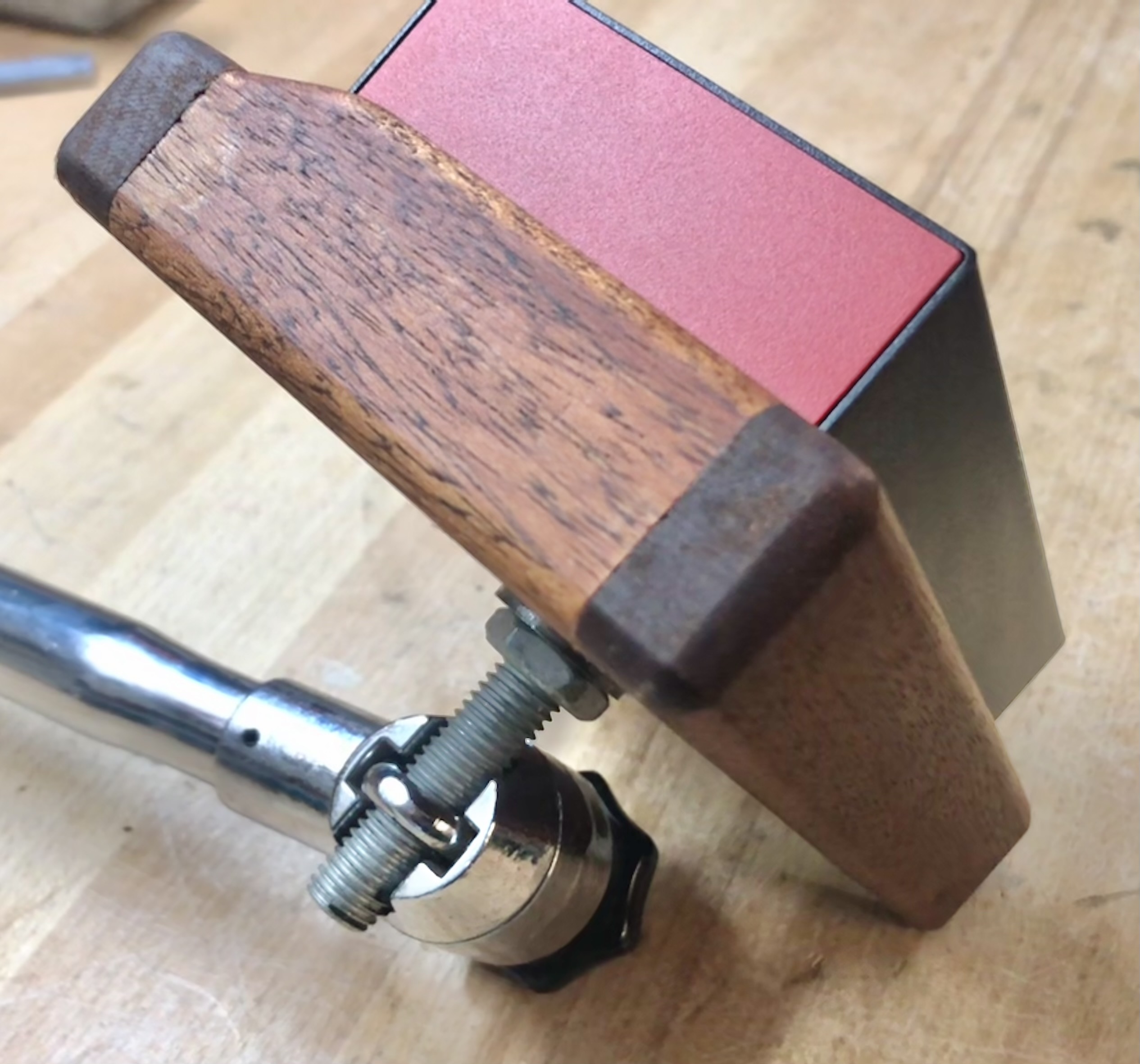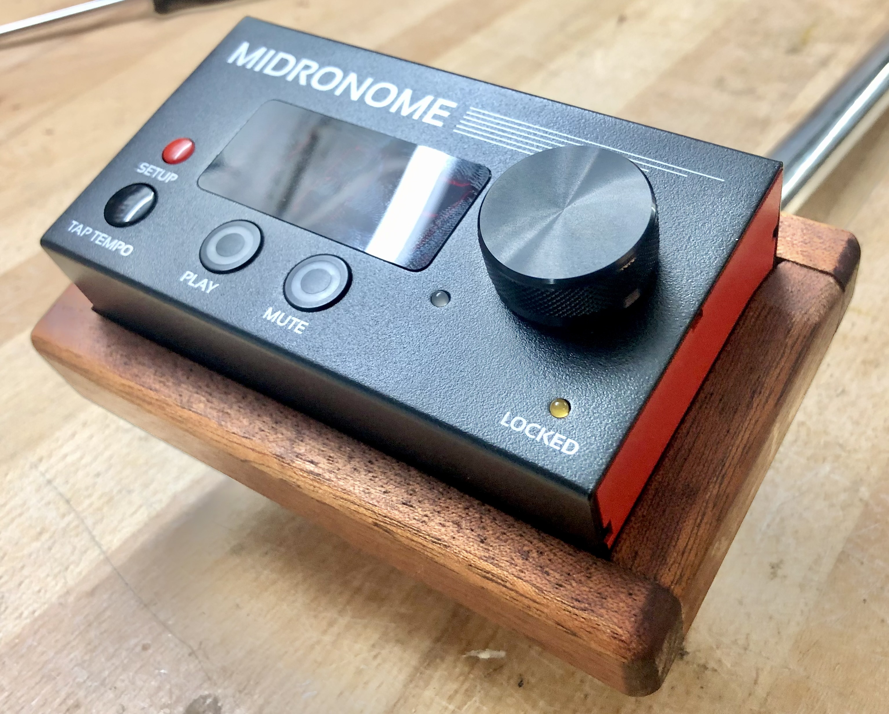 I used a dark wood, I don't know the exact name. The holder is attached with a bolt that I countersunk. The bolt fits into an old drum cymbal arm. This allows me to integrate the midronome into my drum set.