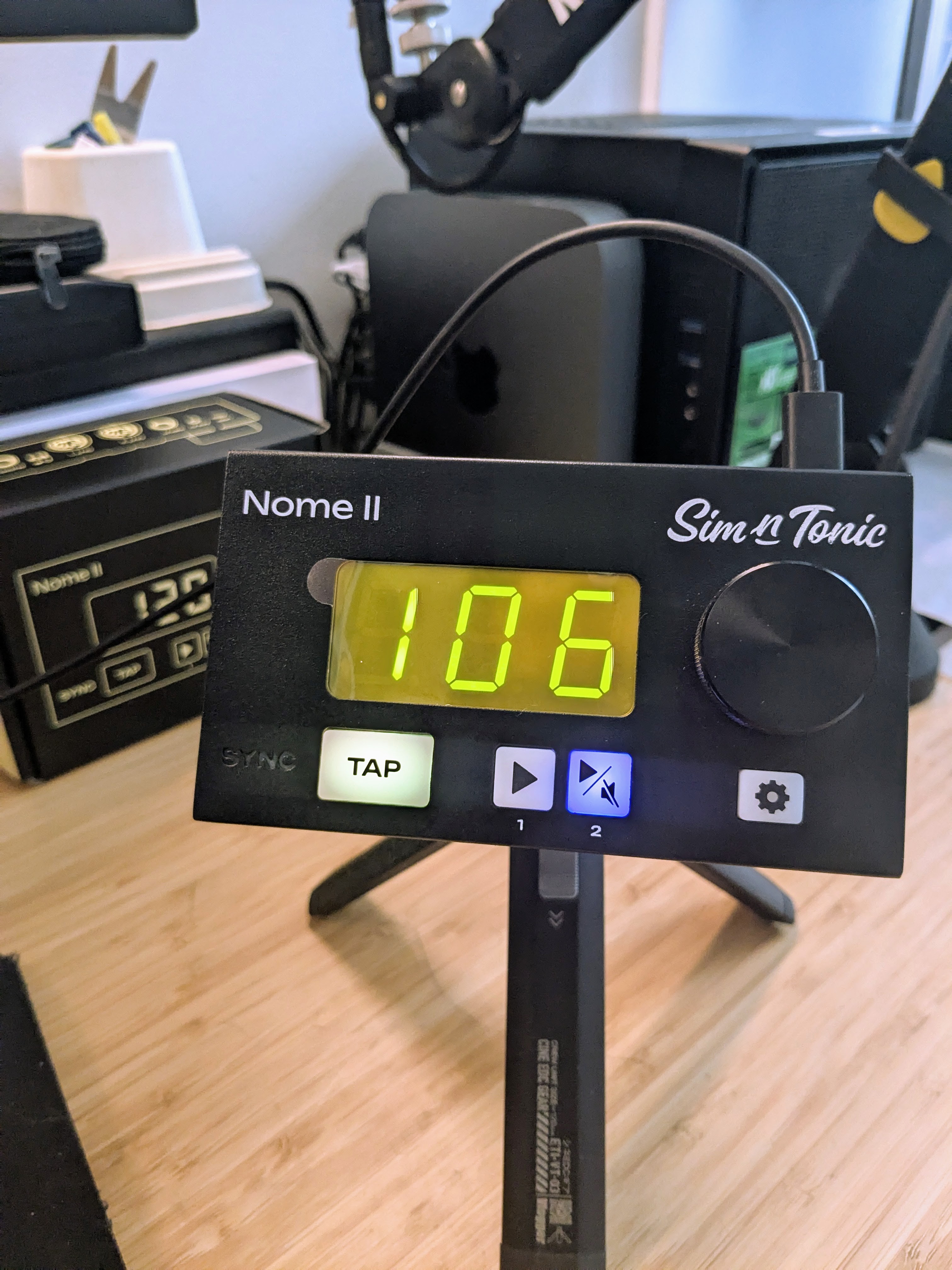 Since the midronome tilts backwards due to connected cables (when it is not standing on a surface), I put two small flat magnets under the device. I recycled the magnets from some packaging. They hold the Midronome very well, even upside down.